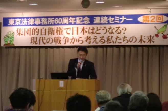 第1部ではイラク、パレスチナの戦場取材をしてきたジャーナリストの志葉玲さんが戦場での取材体験を映像・写真とともに講演。続く第2部では大竹俦幸弁護士、坂本雅弥弁護士が日本の情勢を報告し、第3部は「集団的自衛権で日本はどうなる?現代の戦争から考える私たちの未来」と題して集団的自衛権行使を認めることが日本に何をもたらすか、私たちが取り組むべき課題は何かを考える3者による鼎談で、参加者を交え質疑応答で交流しました。「イスラム国」による日本人拉致殺害事件の直後でもあり、当日は190名の参加者が会場を埋め尽くしました。