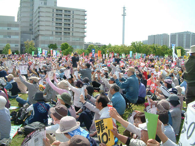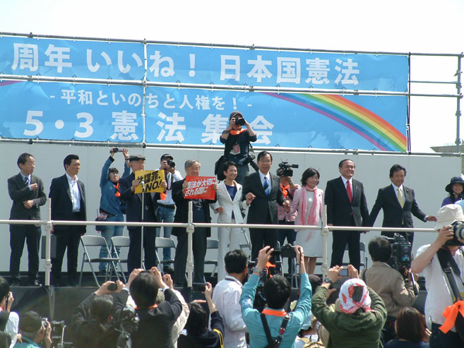 「いいね!日本国憲法、平和と命と人権を!5.3憲法集会」が東京有明防災公園で開かれ5万5000人が参加しました。タレントのピーコさん、作家の落合恵子さんらがリレートーク。今年も4野党の党首クラスが参加し連帯の挨拶をしました。